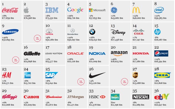 Interbrand’s “best brands” survey for 2012 includes many of the usual world-class names. Note how many of these brand giants are also patent powerhouses in their own right. Nine of the top ten have significant portfolios, and at least five out of the top ten very large ones. For 2012’s top 36 brands see the chart below. For the 100 best with an explanation of each, click here.