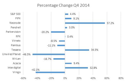 As a group, the twelve companies in the PIPX Public IP Performance Index out-paced the S&P 500 for the 4Q 2014 9.1% to 4.4%, with Neonode, Tessera and InterDigital leading the way, all with 4Q gains in excess of 30%. Marathon, under $100M in market cap for most of 2014 and not represented on the graph below, was up 17% for the quarter and 167% for the year.