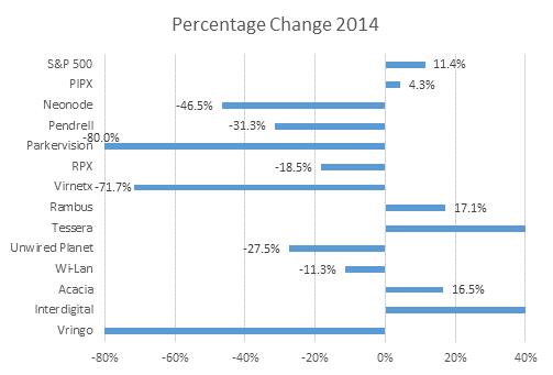 For the year 2014, however, companies in the index fare much worse, with PIPX companies generating a collective return of just 4.3% vs. 11.4% for the S&P 500. Tessera and InterDigital were notable performers each with 40% returns for the year. Rambus and Acacia were up about 17% each.