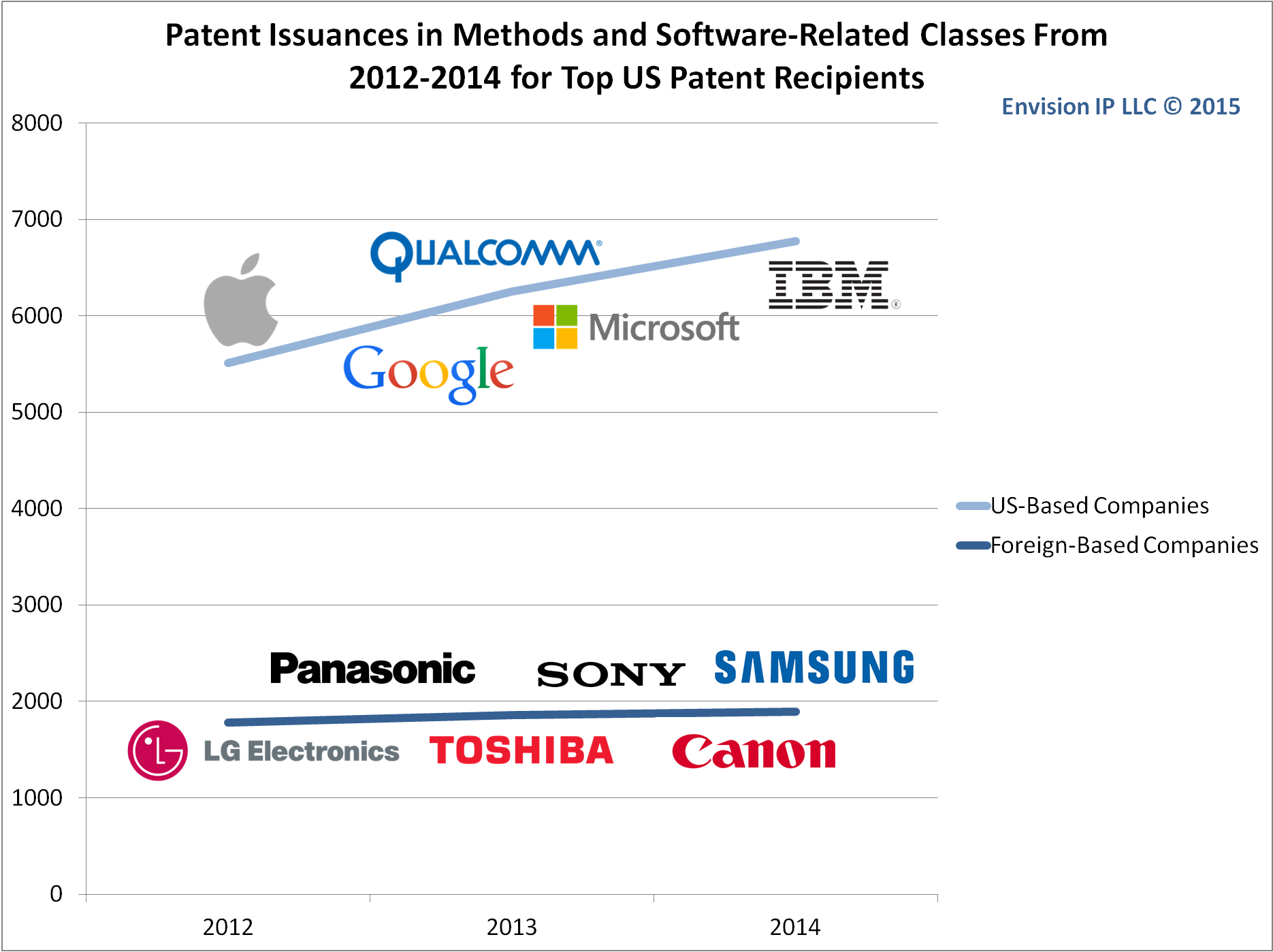 Perennial US patent recipient leader IBM secured 7,540 patents, and received the most methods-related patents with 2,916, 39% of its total grants for last year. Not to be outdone was Apple, with 2,037 patents, 538 or 26%, which are associated with software and methods. Samsung, LG, Qualcomm, Panasonic, Canon and Toshiba, all top-ten US patent recipients for 2014, secured less than 10% in methods.