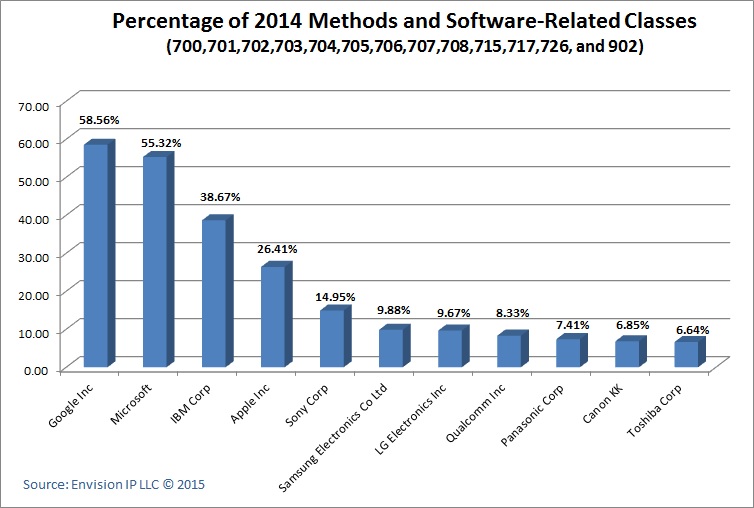 Companies intent on obtaining method patents include Google, for the first time in 2014 in the top ten of US patent recipients, in eighth place just behind Toshiba and Qualcomm. Of the 2,599 US patents granted last year to Google, 1,522, or 59% were in the methods classes. Microsoft, with 2,847 patents received, had 1,575, or 55%, that fall under the heading of methods.