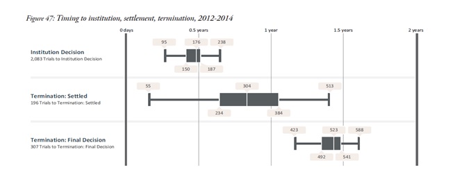 The Lex Machina 2014 review indicates that of the 503 IPRs terminated between 2012 and 2014, 196 or 39% were settled before a final decision was made by the PTAB. (See figure 47 below.)
