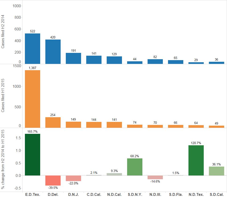 Patent suits filed in the Eastern District of Texas for the first two quarters were up 165.7% over 2014, according to Lex Machina. In the Northern District of Texas, they were up 120.7%. Delaware was down 39.5% over the same period.
