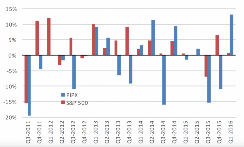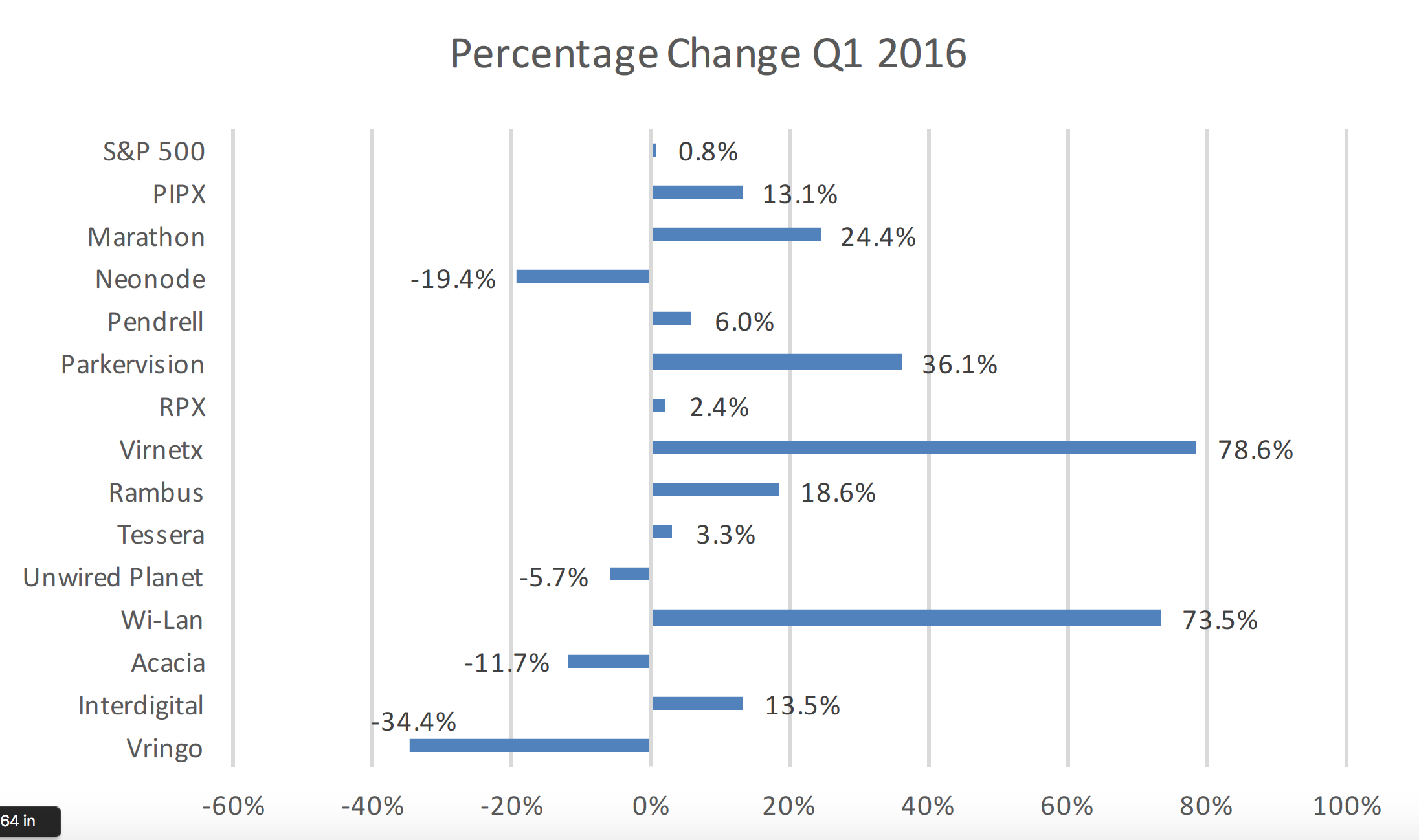 The PIPX public IP licensing index was up 13.1% vs. a barely positive 0.8% for the S&P 500 in the first quarter of 2016. This was the best quarter for the PIPX since it began tracking public IP licensing companies back in July 2011.