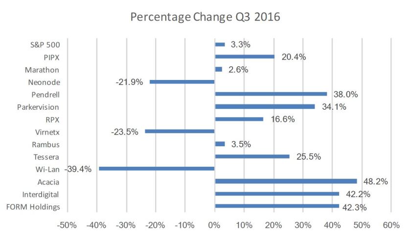 “InterDigital and Tessera, comparative giants in market value, were responsible for 20% of the index move,” said Dr. Kevin Klein, Vice President and GM of Products and Licensing at VORAGO Technologies, who compiles the data. “Acacia was the biggest individual gainer, up 48.2%; WiLAN was the biggest loser, down 39.4%. ”