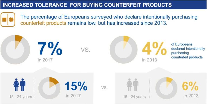In contrast to the overall positive regard for IP rights, however, 41 per cent of young Europeans, ages 15 to 24, said they believed it was acceptable to buy counterfeits if the original product was too expensive. 15% of those surveyed in that age group said that they had intentionally purchased a counterfeit product in the past 12 months, 9% higher than in a similar 2013 study conducted by the European Union Intellectual Property Office (EUIPO).