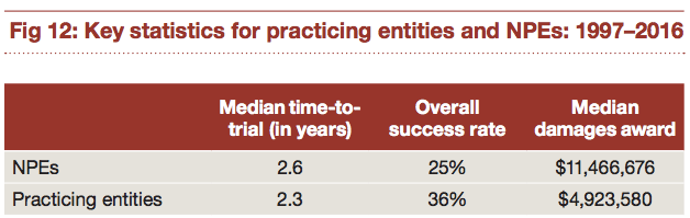 Over a 20 year period from 1997 to 2016, PE’s have a higher success rate at trial than NPEs at trial, 36% vs. 25%, but a significantly lower recovery rate, $4.9 million vs. $11.5 million. For the 2012-2016 period, NPEs out generated PEs in damages by almost 4 to 1 (see above infograph).