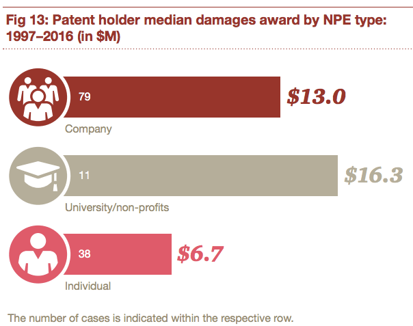 Among NPEs, universities fare best at trial with median damages awards of $16.3M, as opposed to $13M for NPEs and just $6.7M for individual inventors who enforce.