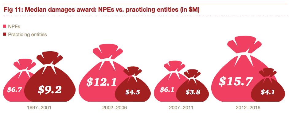 PwC’s analysis shows the continuation of a trend that began in the early 2000s: significantly higher damages awarded to NPEs relative to practicing entities.