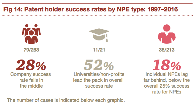 Among NPEs, universities fare best at trial with median damages awards of $16.3M, as opposed to $13M for NPEs and just $6.7M for individual inventors who enforce.