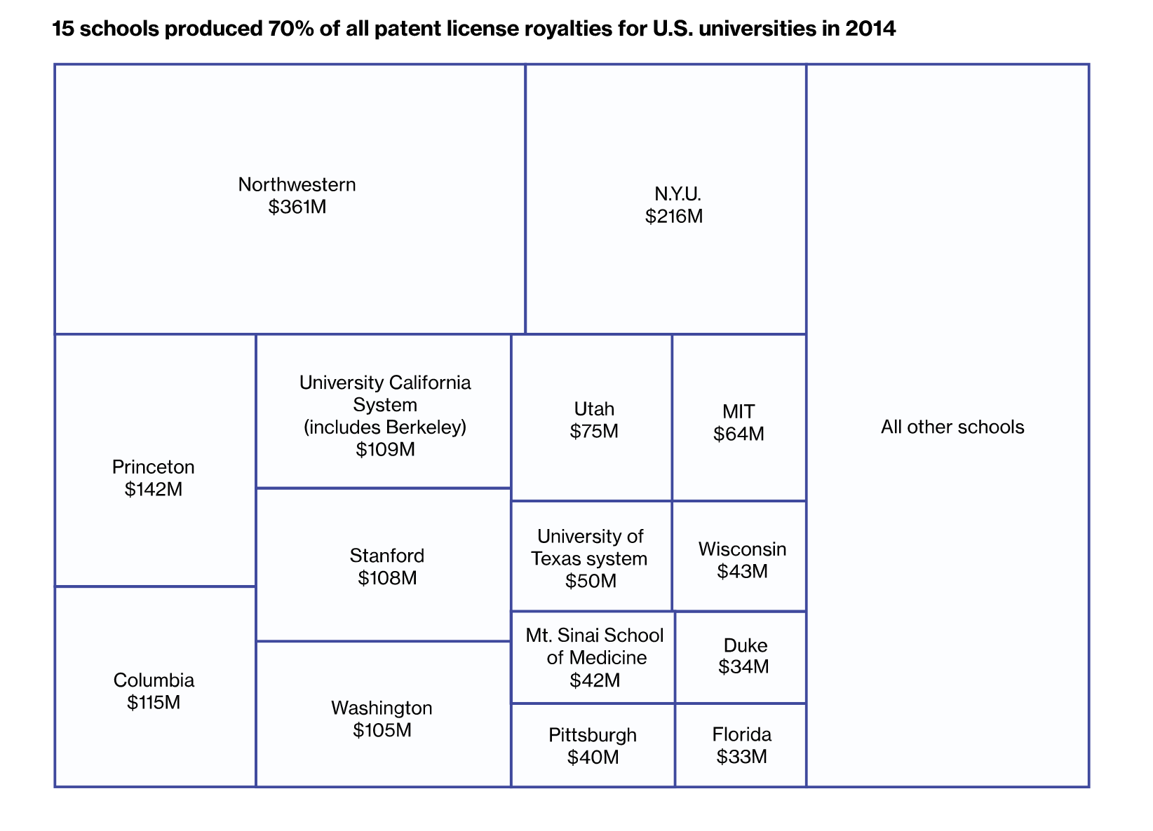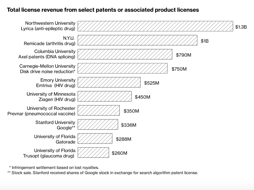 These university-based cases often result in sharing through cross-licensing. Remicade, for example, a highly successful biologic for treating auto-immune responses like Crohn’s disease which has generated over a $1 billion so far, has multiple university participants, but is primarily owned by NYU.