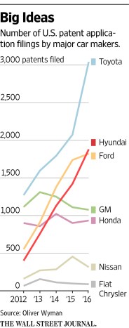 The WSJ reports that a large part of filing in the auto industry has been with regard to self driving and connected cars, with 65% of GM’s filed patents in this area. Toyota, with more than 3,000 patents filed is by far the leader, but does not appear to figure into the self-driving patent race, choosing to focus on other areas of innovation, like efficiency (see graph below).