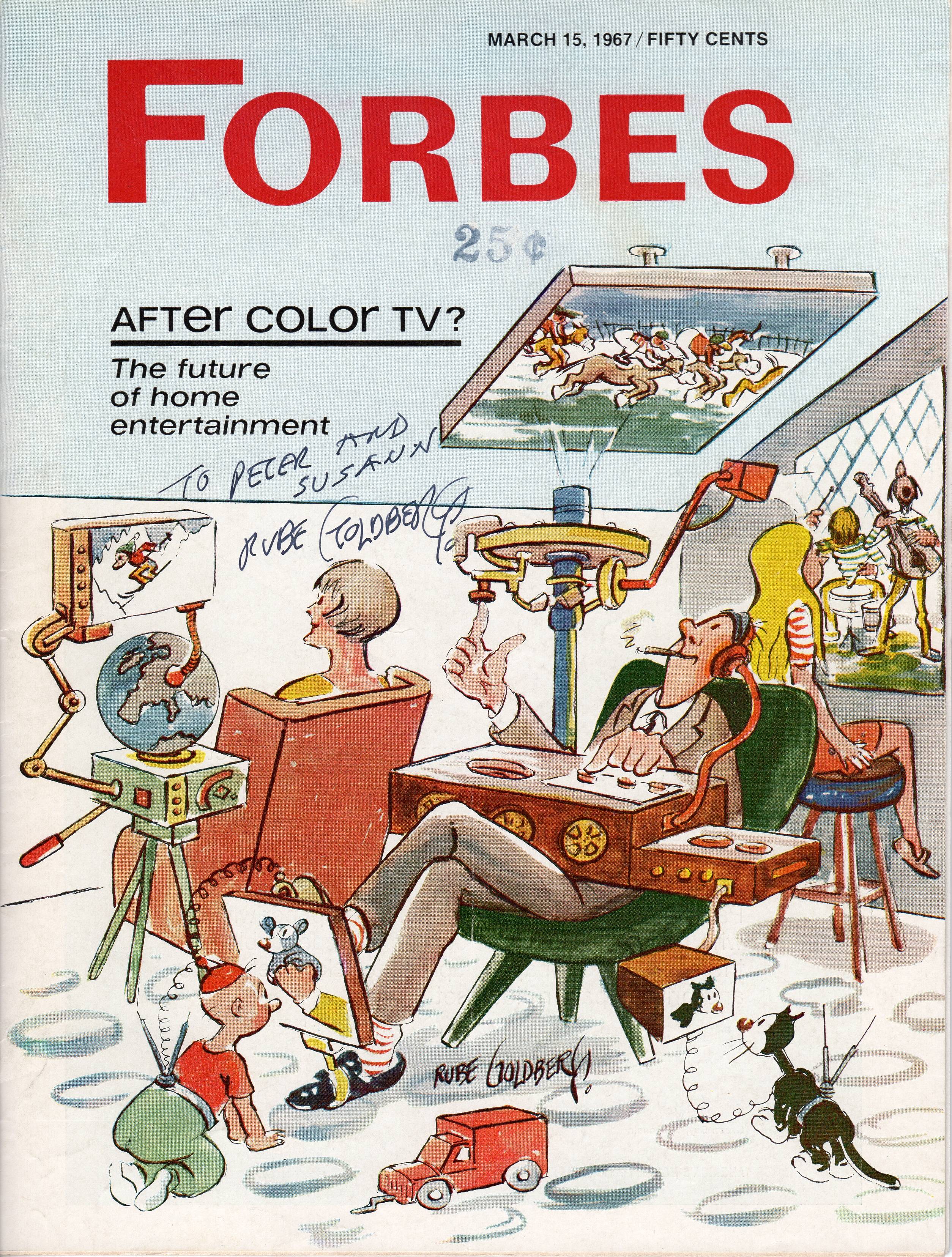 But Goldberg, born on July 4, 1883, was also a visionary, who saw the impact of personalized communications decades before it occurred. His Forbes cover,“After Color TV: The Future of Home Entertainment,” from March 15, 1967 (below) depicts a family with each member engaged with its own mostly flat screen and targeted content – including the baby and cat. Recall that in 1967 the idea of the color TV, aka “talking furniture,” was still relatively new.