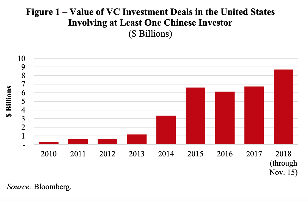 Since 2014 Chinese venture capital investment in the U.S. totals $31 billion. The report cites analyst that estimate “Chinese investors participated in 10-16% of all venture deals in the United States between 2015 and 2017.”