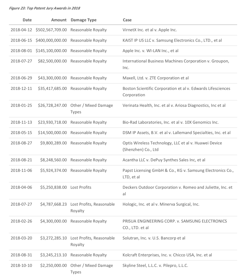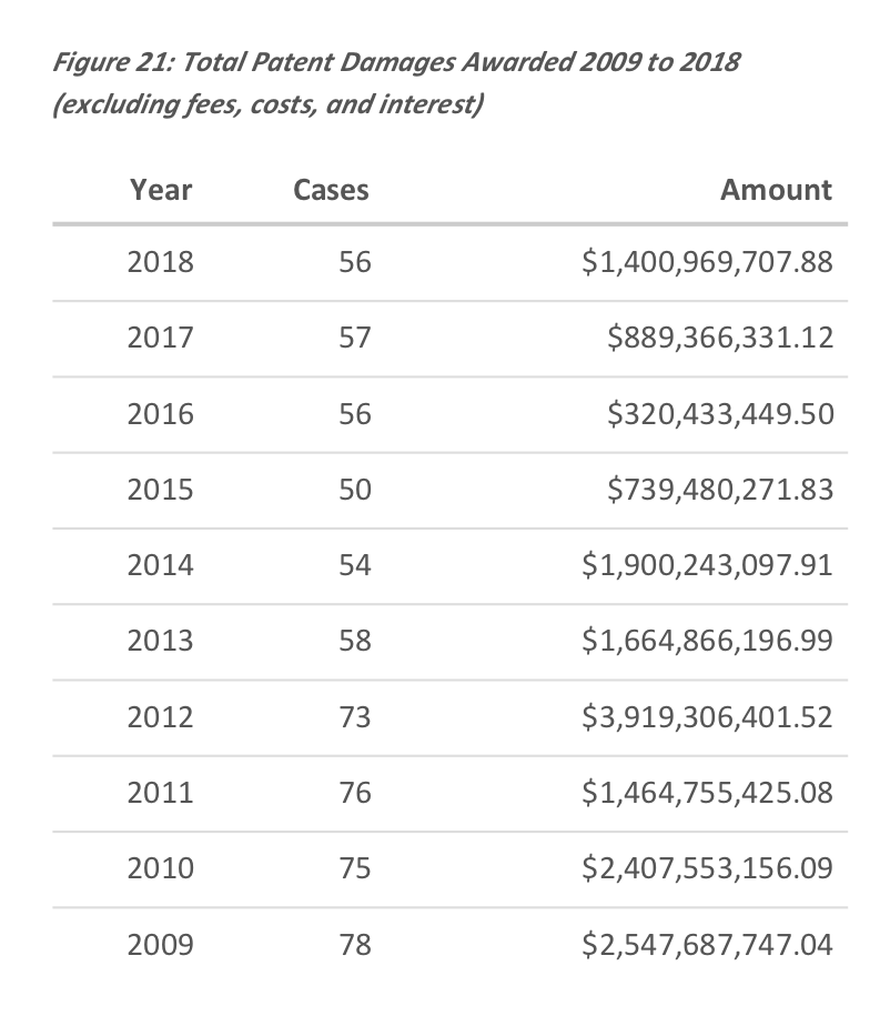 Two cases were responsible for about two-thirds of that amount or $900 million, according the Lex Machina 2018 Litigation Report, leaving less than $500 million among 16 cases.