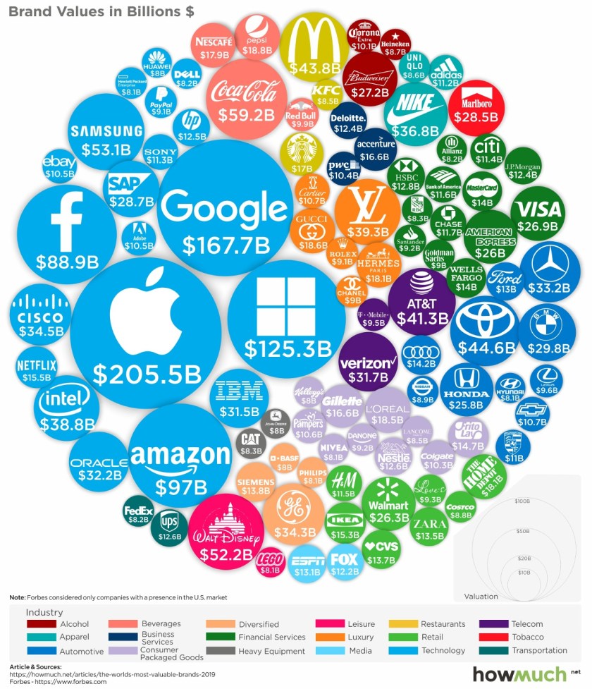 The graphic above illustrates the relative value of the top brands within their respective industries and versus each other, one-to-one.  The value of brands is built over time and reflects criteria such as revenue, profitability, reputation and advertising dollars spent (see Methodology & Measurement below).