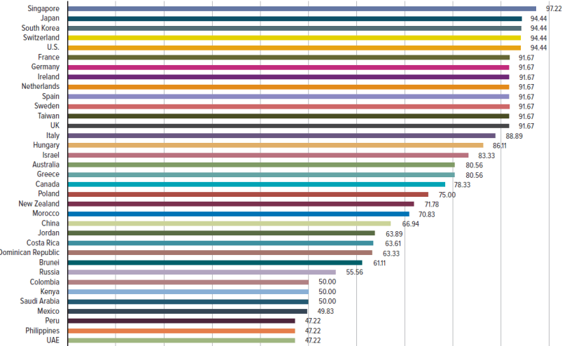 While the U.S. still remains the top nation overall for intellectual property rights, lags behind Singapore, Japan, South Korea and Switzerland in the category Patents, Related Rights and Limitations and trails in other key categories.