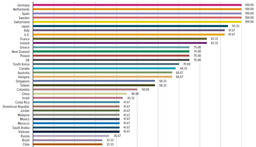 These are the findings of the 2020 U.S. Chamber of Commerce International IP Index, presented with the Global Innovation Policy Center (GIPC). The U.S. is at or tied for the top spot in copyrights and trademarks, and it is 16th in Design Rights, just behind Turkey. In Trade Secret Protection, the U.S. was tied for 7th place with Italy.