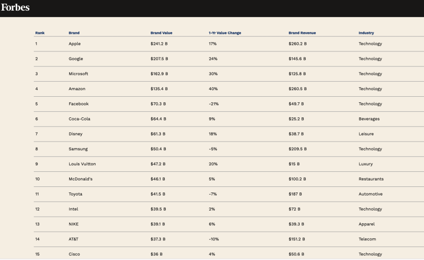 Four of the top five brands, Apple, Google, Microsoft and Amazon increased in value from 17% to 40%. The fifth most valuable brand, Facebook, declined 21%.