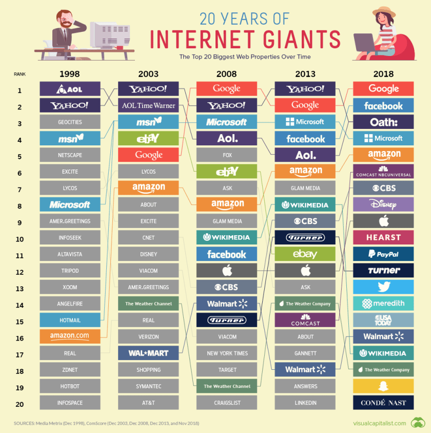 Looking back at 1998, web leaders included AOL, Geocities, Netscape, Lycos, Excite, InfoSpace and American Greetings. All are either gone or barely functioning under another another banner.