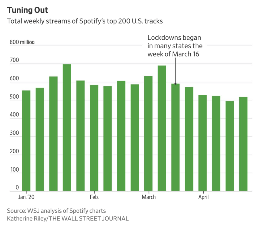 In a separate article WSJ states that pop music has become less popular amidst the pandemic as people, perhaps older adults, turn to classics, and touring has been halted.