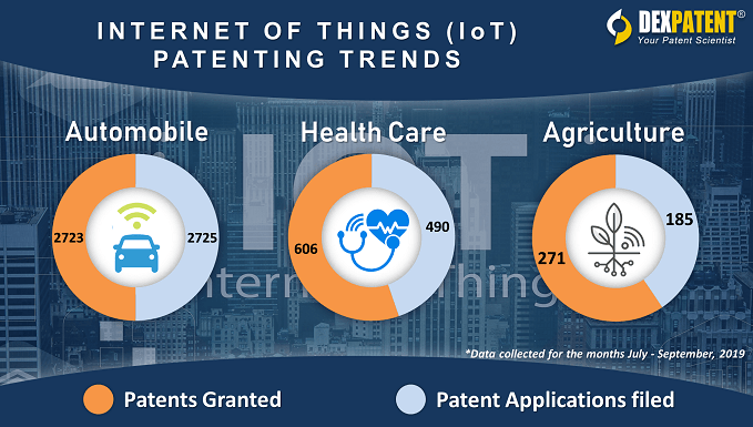 Among the most active areas for IoT – Automobile, Healthcare and Agriculture – only the Automobiles industry has more applications filed than have already been granted (see infographic above).