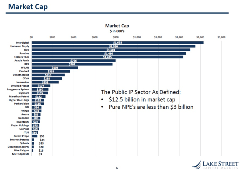 It is easy to forget that more defensive-minded patent-rich companies such as Microsoft, IBM and Samsung are also public PIPCOs, although their huge market cap and revenue streams make them much less dependent on the outcome of individual IP disputes or licenses.