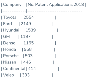 The following list provides an idea of the patent filing by company. Toyota and Ford are significantly ahead of the competition in terms of sheer numbers. Hyundai is number three on the U.S. grant list for auto manufacturers, well ahead of GM.