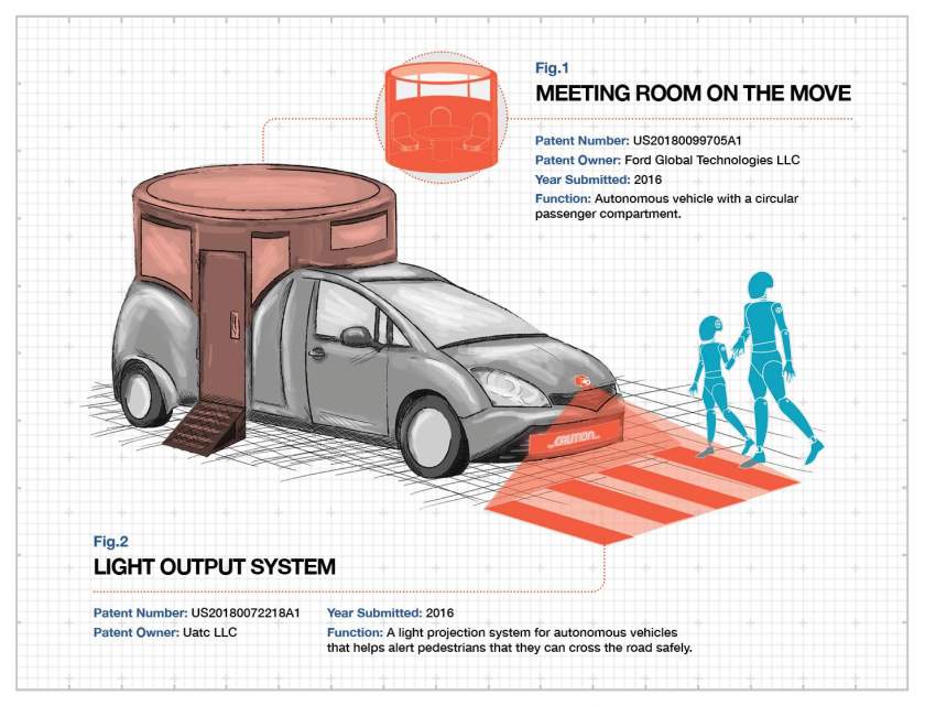 Another vision of the future as seen by vehicular engineers is Ford’s rather literal interpretation of the mobile office (above),‘Vehicle with round passenger compartment.’ The patent suggests a cylindrical passenger compartment with a round table and chairs for meetings on-the-go.