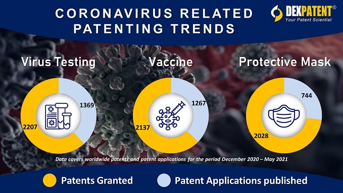 Significantly fewer patents have been published and are waiting to issue, according to patent data analytics firm, DexPatent, especially in the area of masks, where 2,028 patents were granted worldwide from December 2020 to May 2021. Currently, there are just 744 published patents waiting to issue, about 63% fewer.