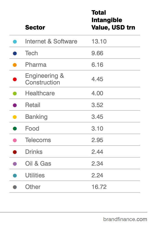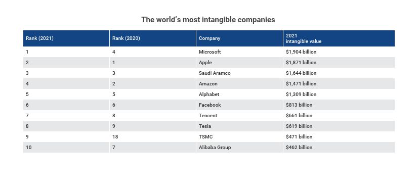 It’s no surprise that the world’s most ‘intangible’ companies, Microsoft and Apple, are easily identified. They have very real market valuations of just under $2 trillion each, much of it related to intellectual property assets like patents, trademarks and trade secrets, as well as licenses.