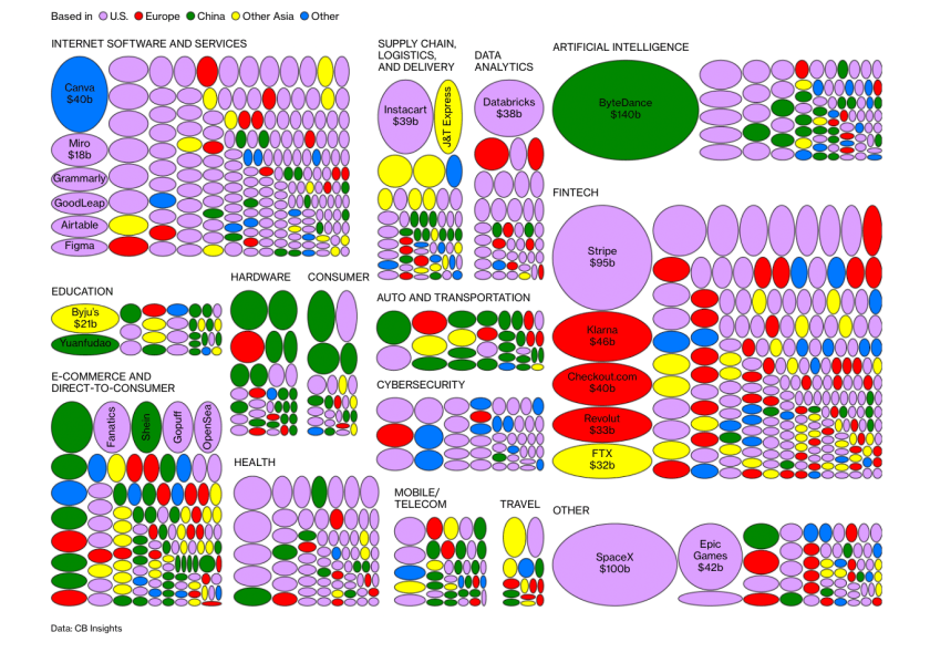 There were three and a half as many new unicorns in 2021 (518) as there were in 2020 (134) according to CB Insights. While the U.S. still leads, an increasing number of private companies valued at billion dollars or more are located in China, other parts of Asia and Europe.