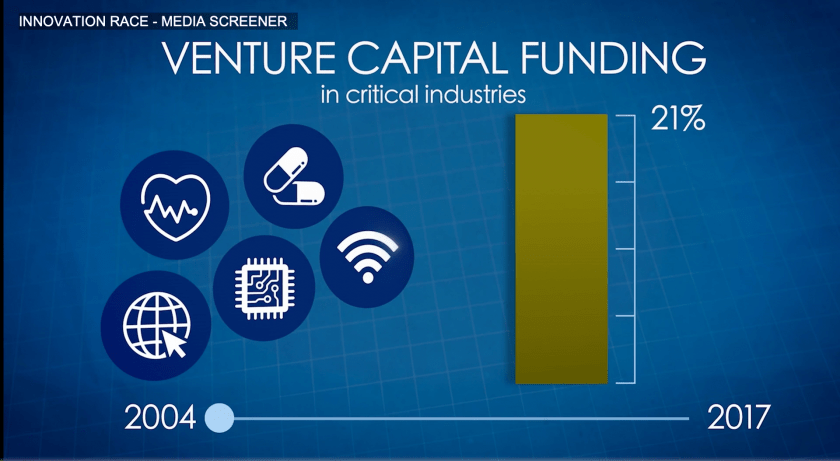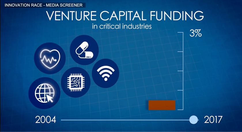 U.S. venture capital funding has dropped from 21% in 2004 (see graph above) to just 3% in 2017. China has filled much of the void and continues to.
