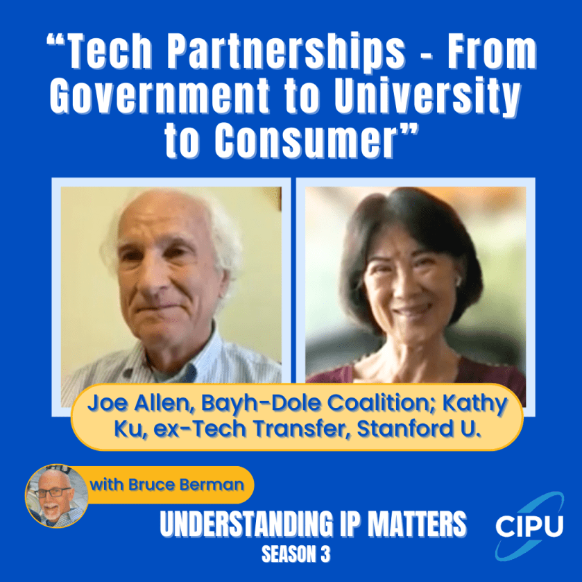 This season’s first episode of UIPM features Kathy Ku, Executive Director of Stanford University’s Office of Technology Licensing for 27 years until she retired to join Wilson Sonsini, and Joe Allen, Executive Director of the Bayh-Dole Coalition and founding director of the Office of Technology Commercialization at the Department of Commerce. The episode, which can be found here on Wednesday morning, is called, “Tech Partnerships – From Government to University to Consumer.”