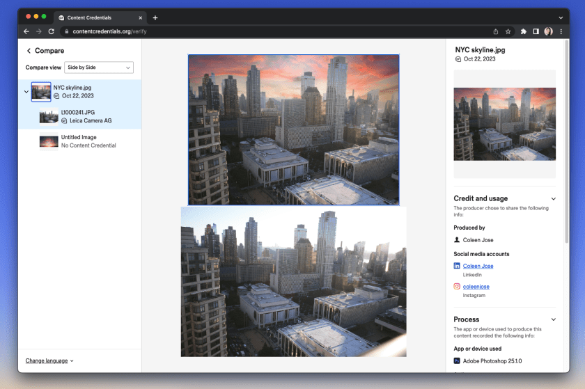Get credit for photography work: Content Credentials enable photojournalists and creatives to assert credit for their work, ensuring that wherever one of their images goes, their identity travels indelibly with it.