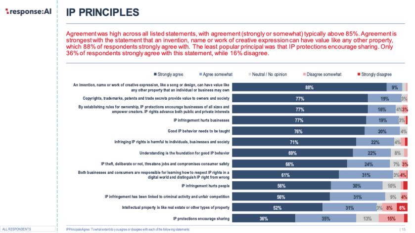 The greatest amount of disagreement was spurred by statements that IP is property just like real property (14%) and that IP protections encourage sharing (16%).
