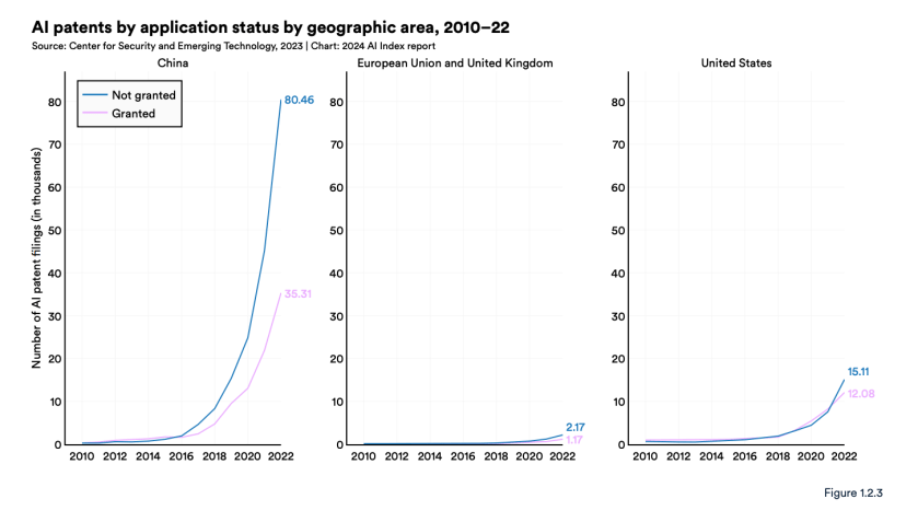China surpassed the U.S. in AI patents in 2013, according to CSET, and kept growing. These patents relate to mathematical relationships and algorithms, which are considered abstract ideas under patent law. They are said to be more readily granted in China than the U.S. and Europe. Under the scrutiny of litigation many of these patents are likely to be found invalid.