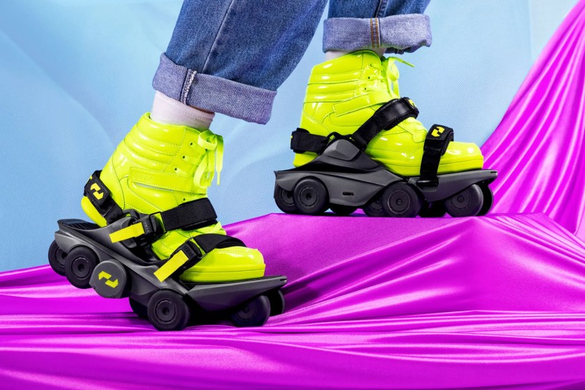 From tiny Shift Robotics, battery-powered “Moonwalkers” (above), wheeled shoes allow people to walk normally (not skate), just faster and more easily. The Moonwalkers use AI to sense when you are speeding up or slowing down and adjust accordingly. The wheels lock automatically when you are taking the stairs.