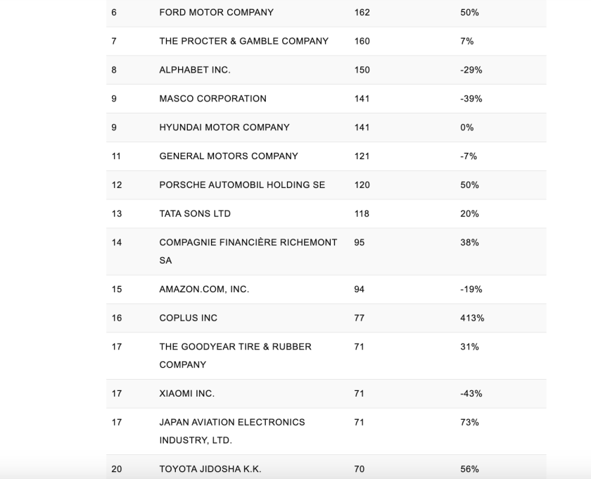 Among the big gainers in design patents are Ford Motor Company, up 50% to 162, Porsche Automobile Holdings, up 50% to 120, Tata & Sons LTD (Jaguar, Land Rover), up 20% to 118, and Toyota Jidosha K.K., up 56% to 70 design patents.