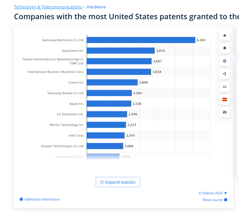To the surprise of many, Big Blue was never close to being the leader in active U.S. patents held. They received many, but frequently allowed them to lapse if they did not see that maintaining them made business sense. You could say they “open-sourced” them before there was a concerted effort to maintain open source. Samsung has maintained the highest number of active U.S. patents for at least a decade.
