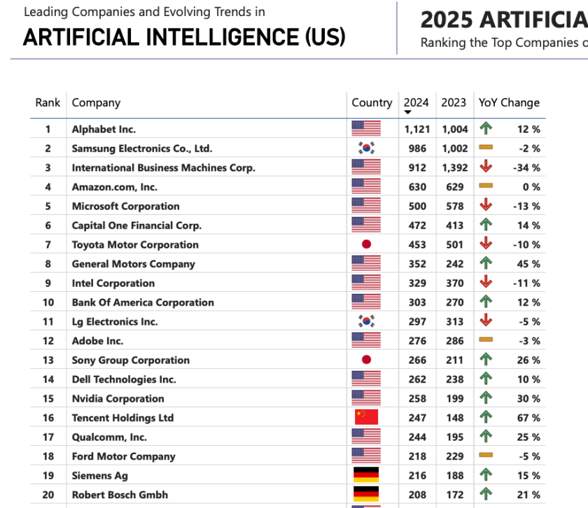 One expects to see the Magnificent Seven on the AI patent leaders list (Alphabet, Apple, Amazon, Meta, Microsoft, Nvidia, Tesla), as well as perineal U.S. patent holder Samsung, but in the top ten are also two financial institutions, Capital One, at number six for 2024 and Bank of America. Automakers Toyota and General Motors (up 45% year over year) are also among the leaders which other automakers are much further down the list.