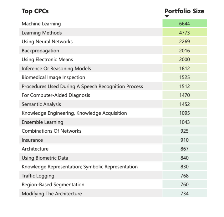 Leading class for receiving AI patents: Machine Learning, followed by Learning Methods and Using Neural Networks.