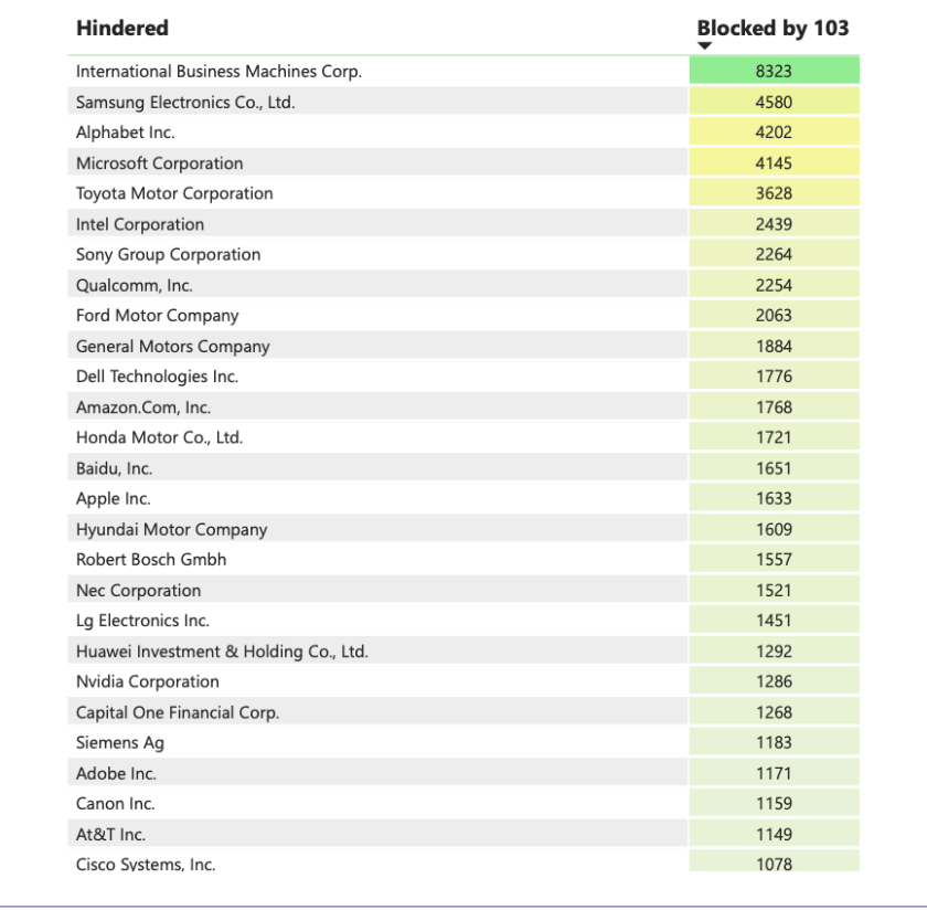2023 overall leader IBM with 1,392 grants was down 36% in 2024. The biggest gainer year-over-year in the top 20: China’s Tencent, up 67%. It’s fascinating to peruse Harrity LLP’s top 100 for trends and stand outs. I strongly recommend it.