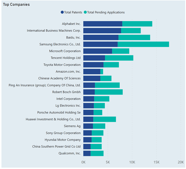 AI patents could be buried within other classes, such as Semiconductors or Blockchain, or, perhaps, the algorithm patents associated with AI are just not that highly patentable or certain. It’s unlikely that all of most fundamental AI patents have been granted.