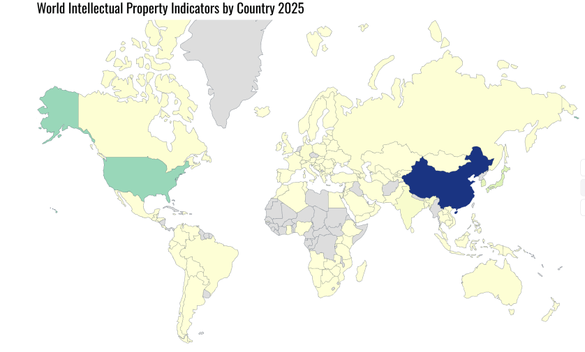 World Population Review’s “World Intellectual Property Indicators by Country 2025” is a strangely useful resource. It shows patent applications for 2023, which are an even less reliable indicator than those granted, are growing rapidly in some nations, with filing up 100% or more.