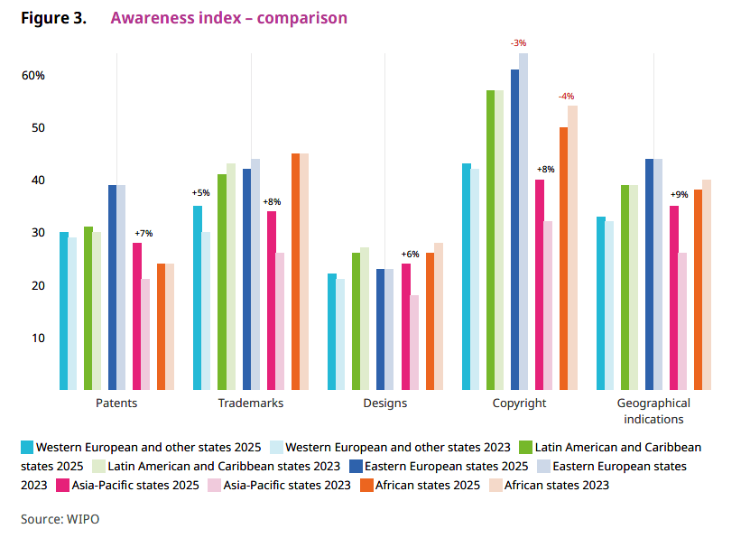 - Awareness grew the most for trademarks and copyright, which rose from 30% to 36% and 38% to 44% respectively between 2023 and 2025.Regional variations persist: