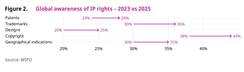 The World Intellectual Property Organization (WIPO) Pulse Report notes that awareness of patents, trademarks, designs, copyrights and geographical indications has increased globally compared to the previous edition of the survey in 2023. However, this growth is uneven. In some regions, people show rising familiarity with IP rights while in others there is a decline.