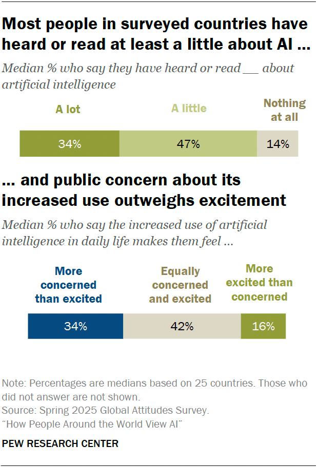 According to Pew Research most people are more concerned than excited about AI’s use, and trust their own country and the EU to regulate it than trust the U.S. or China. A median of 34% of adults say they are more concerned than excited about the increased use of AI, while 42% are equally concerned and excited. A median of 16% are more excited than concerned.