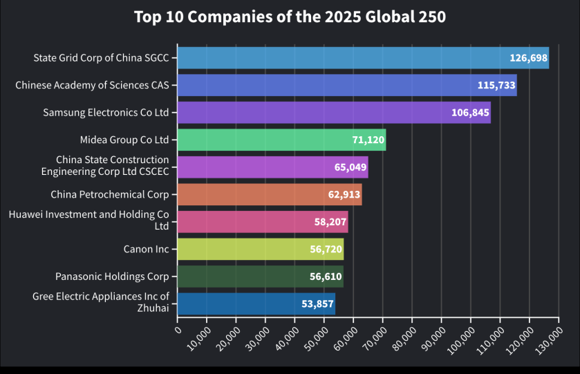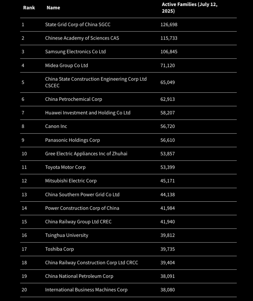 The other four companies in the global 50 according to IFI Claims analysis: Qualcomm (34), Alphabet (42), Apple (43) and Intel (45).