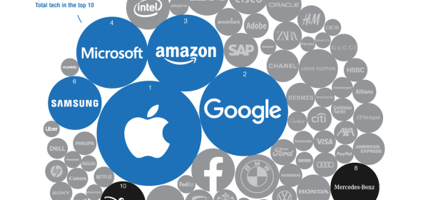 The value of the largest technology company brands has more than doubled since 2001. The cumulative brand value of leading techcos in 2001 was $988